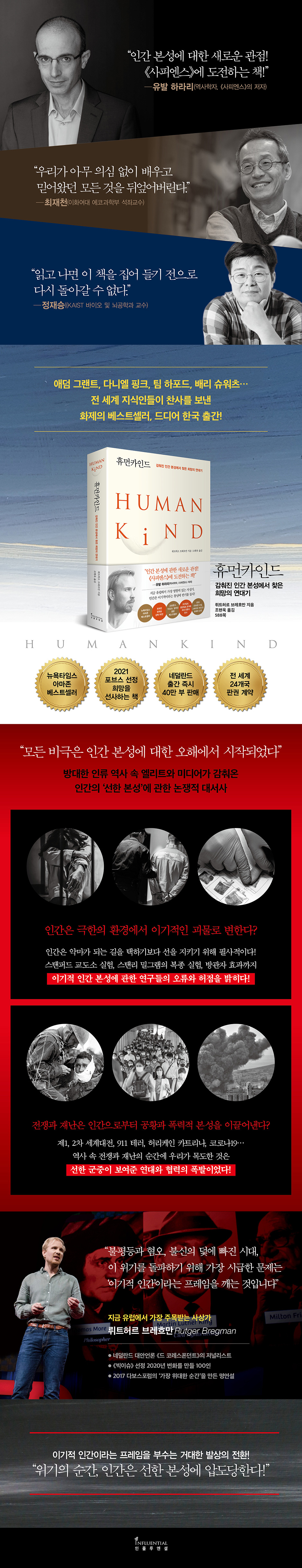 인간의 본성은 과연 '선'과 '악', 어느 쪽에 가까운가? 아마 '휴먼카인드'에게 가장 열렬히 쏟아질 관심은, 해당 장르의 거탑인 '문명' 시리즈와의 비교일 것이다. 게임메카는 세가로부터 테스트 코드를 받아 오픈데브에 참가했는데, 체험할 수 있는. 인간이 지닌 본성의 선함을 믿고 타인에 대한 이해와 연민을 실천할 때 우리는 더 나은 휴먼카인드가 될 수 있다. 대담하고 포괄적인 주장을 담은 이 책은 사회, 민주주의 및 인간 본성 자체에 대한 믿음을 다시 생각하게 만들 것이다. 이것이 인간만이 지닌 엄청난 힘이다. 그리고, 그 방법이 이 게임을 설명하기도 가장 쉬울 것이다. 이 책에서는 아마도 인간의 종말까지 이어질 '주제'를 다룬다. 좋은 사람이 되려고 애쓰는 데 온 힘을 쏟는다.(<휴먼카인드>, 243쪽) 그걸 외면하지 말자고, 뤼트허르 브레흐만은 그리도 방대한 책을 냈나 보다. 현재 휴먼카인드는 유저가 특정 시나리오를 직접 플레이하고, 이에 대한 피드백을 개발진에게 전달해 게임에 반영하는 오픈데브 (opendev) 방식으로 개발 중이다. 한국 시간으로 6월 3일 새벽 2시. 《휴먼카인드》에서 저자는 '이기적 유전자', '이웃집 살인마', '호모 이코노미쿠스', '만인에 대한 만인의 투쟁'에 이르기까지 우리의 정치 경제적 시스템, 지식과 세계관 등이 인간에 대한 냉소적 견해를 기반으로 작동하고 있다고 날카롭게 지적한다. 어떤 책은 우리의 생각에 도전한다.